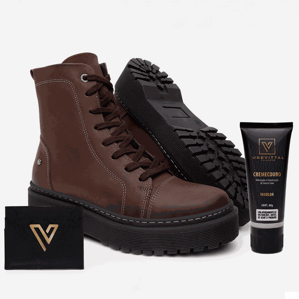 Apresentamos o nosso Kit Vittal. Nele, temos disponível o coturno Laura, que é um verdadeiro coringa para o seu dia a dia, o nosso creme hidratante que vai deixar o seu coturno ou qualquer outro produto em couro impecável por muito mais tempo, e pra finalizar, o nosso porta cartões em couro, sofisticado e funcional.