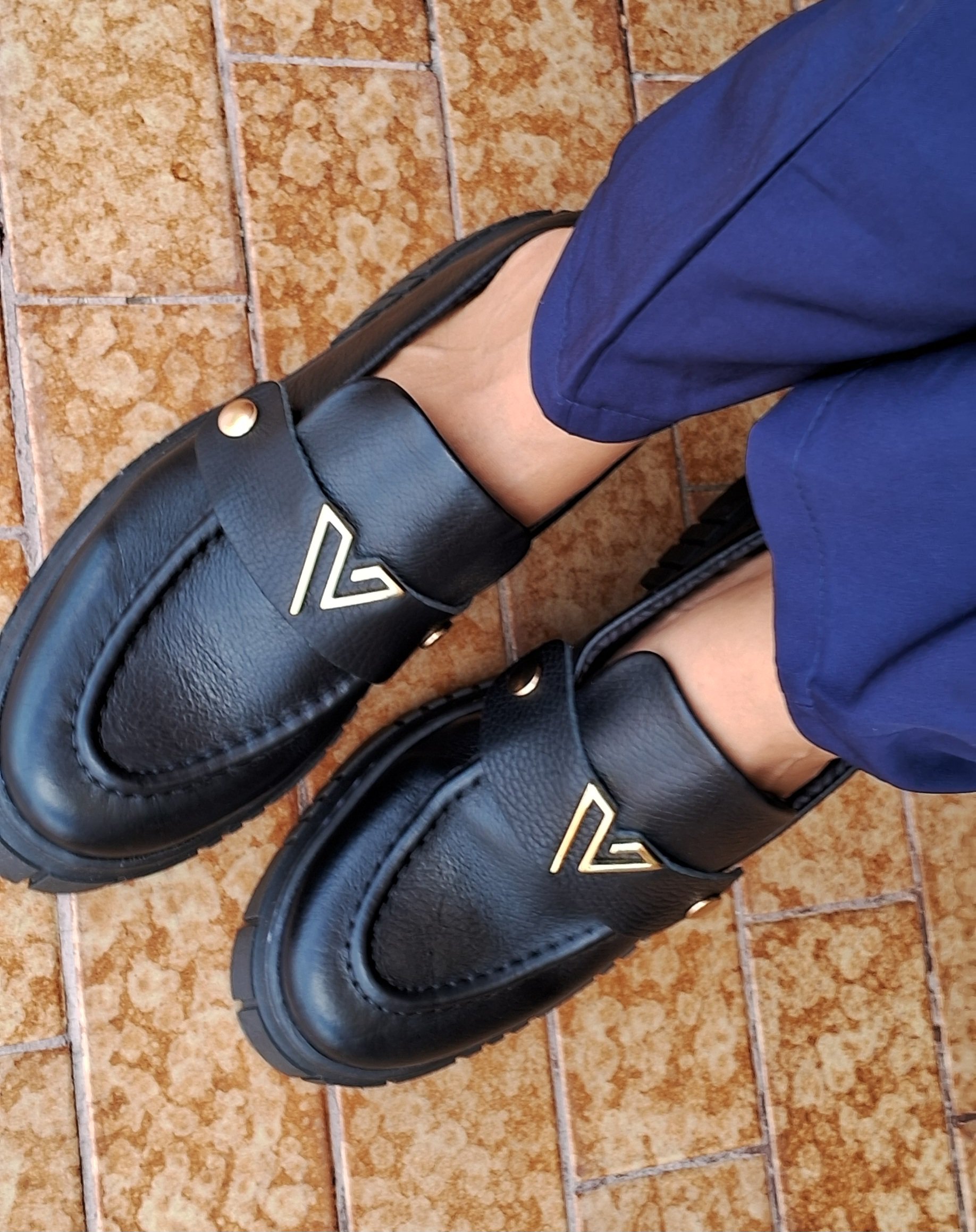 Mocassim Feminino Tratorado Couro Preto com 3 Fivelas Removíveis