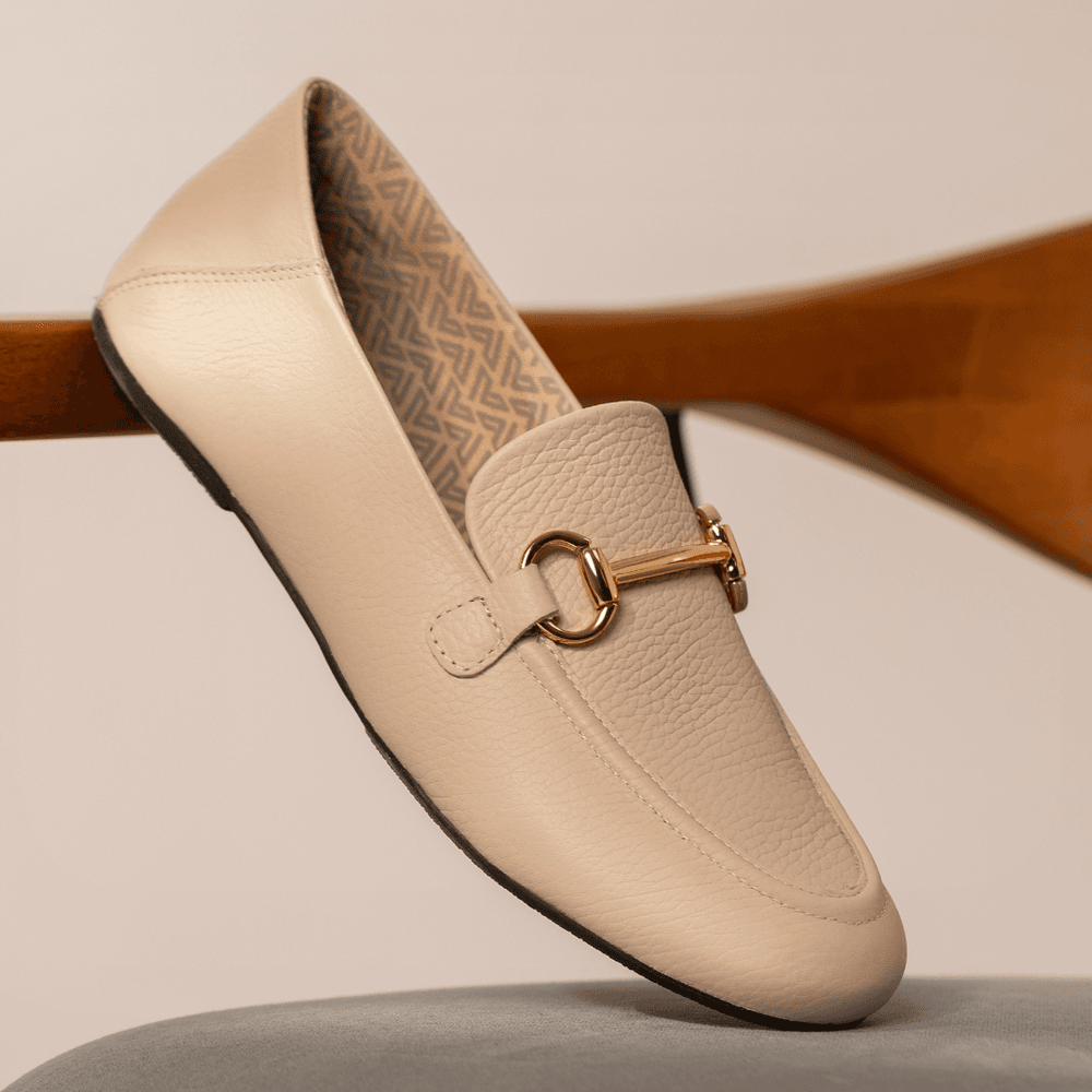 Mocassim Feminino Vittal Aurora em Couro Legítimo OffWhite com Fivela Dourada