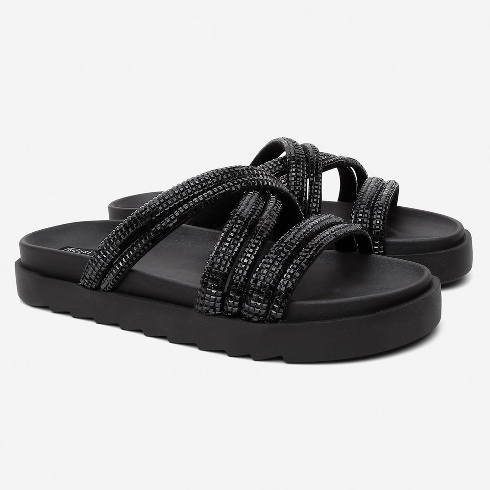 Sandália Papete Feminina Vittal Gaia Confort Preta Com Tiras Trançadas