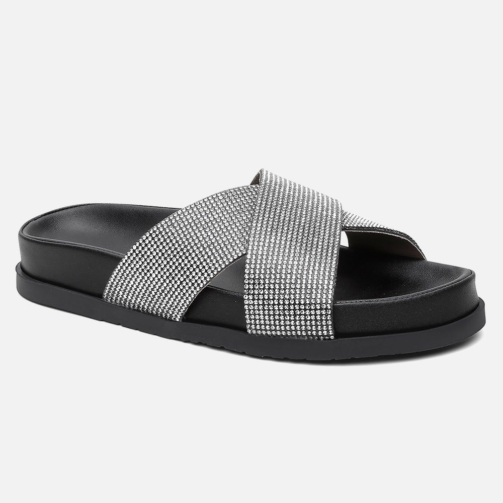 Sandália Papete Vittal Carol Preta com Manta de Strass Solado Confort
