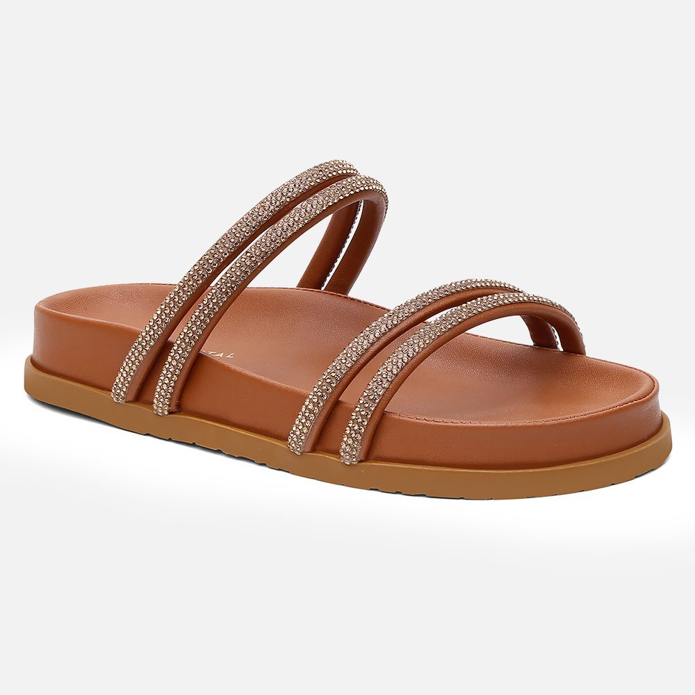 Sandália Papete Vittal Caramelo com Tira de Strass Dourada Solado Confort
